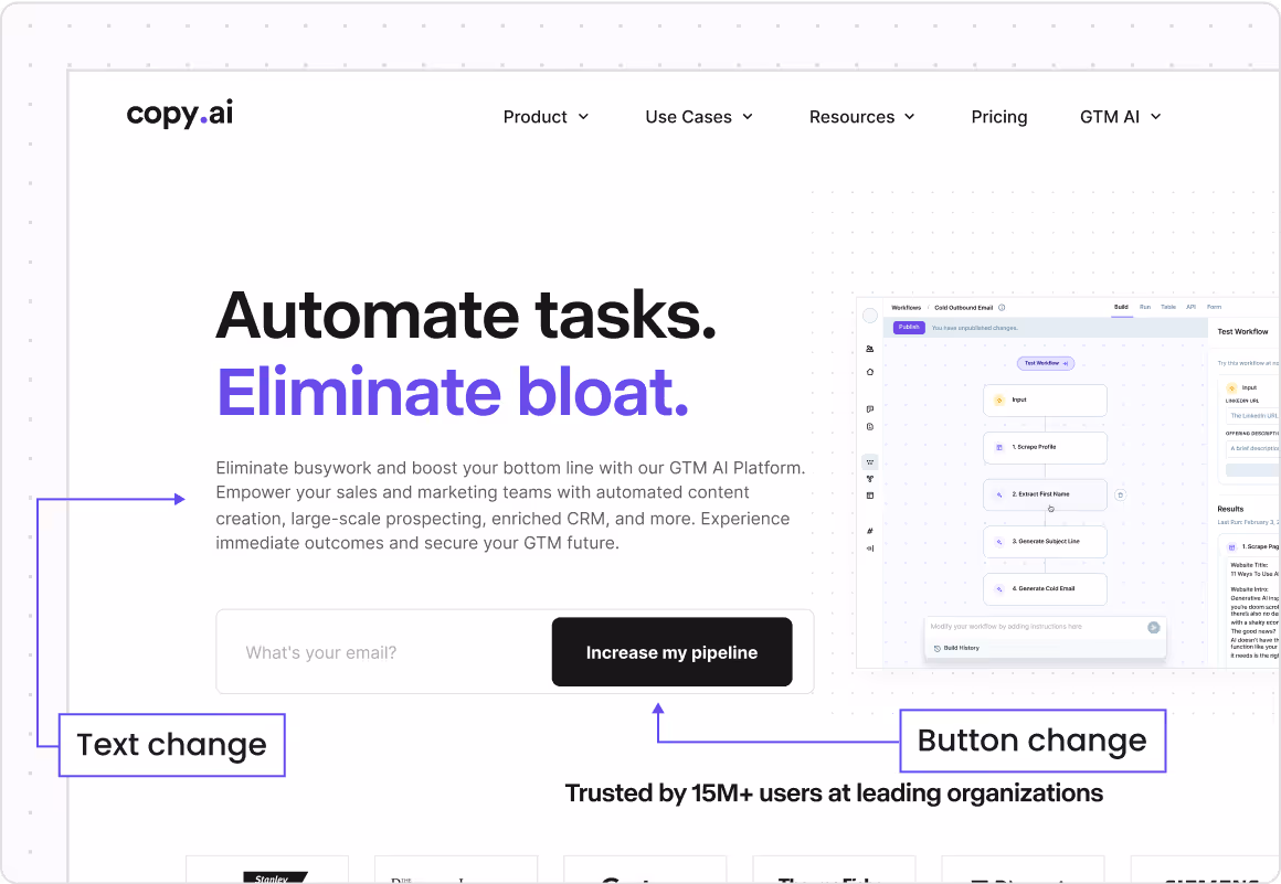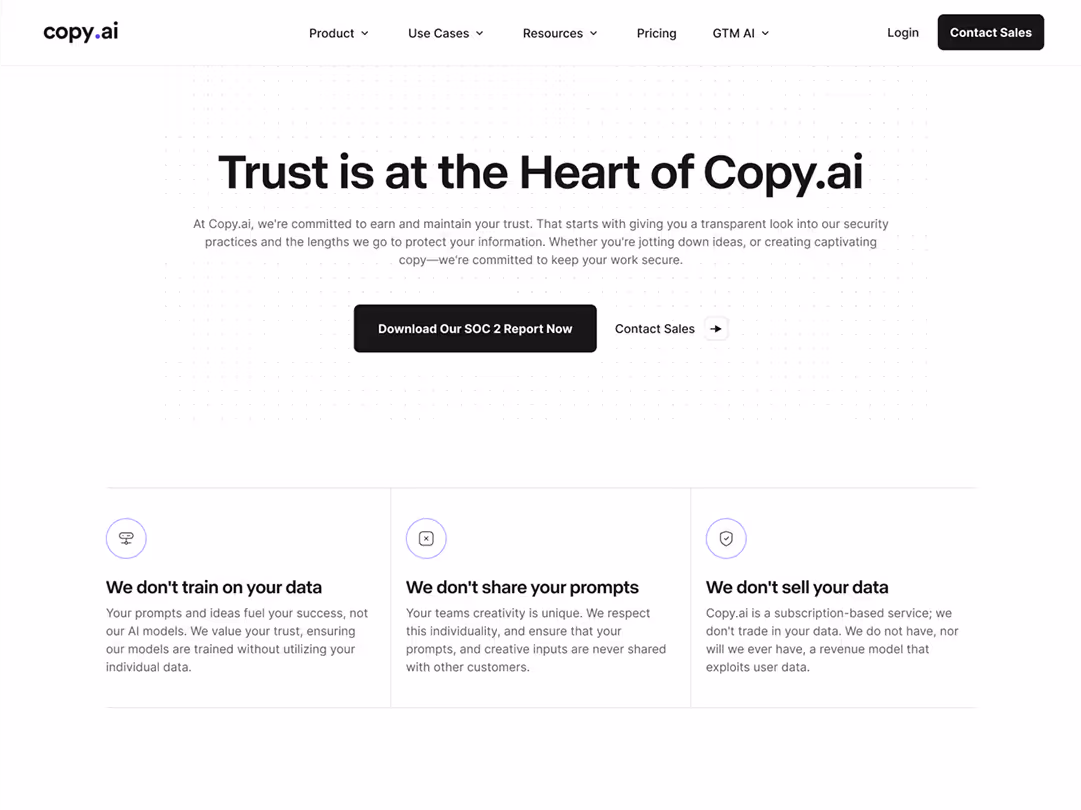 Copy.ai’s leadership wanted to transform the company’s positioning from a tool for individual contributors into a platform for sales and marketing leaders at enterprise organizations. This required shifting away from SEO-driven growth and product trials to building a site architecture that could capture, convert, and accelerate enterprise pipeline. The marketing team needed a trusted partner to quickly scale their website output, support evolving brand direction, and provide frameworks their lean team could confidently manage.