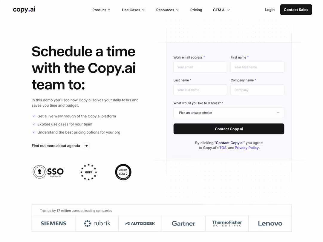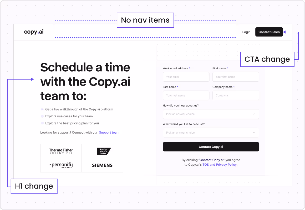 When Zabal began supporting Copy.ai’s team with web maintenance support, we also (always) review the existing sitemap, analyzing which pages were driving organic value and effectively serving buyer needs. From there, we identified gaps and recommended new pages and structures aligned with B2B SaaS best practices. This approach not only strengthened Copy.ai’s positioning against competitors but also built a scalable information architecture to support their shift toward enterprise growth at both the overall site navigation and page-level architectures.